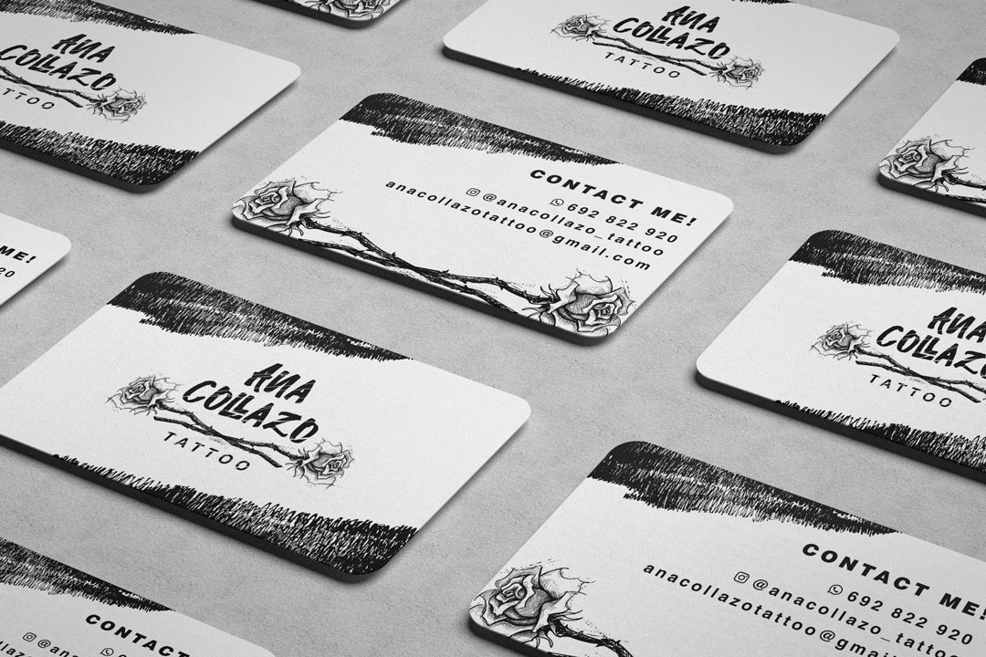 Creación de identidad corporativa para Ana Collazo Tattoo, utilizando la ilustración para destacar el concepto del estudio de tatuaje y una tipografía lo bastante sólida pero con características propias de lo «hecho a mano» para armonizar el conjunto.